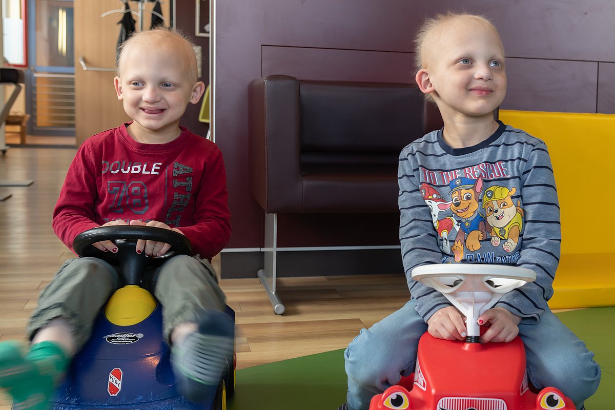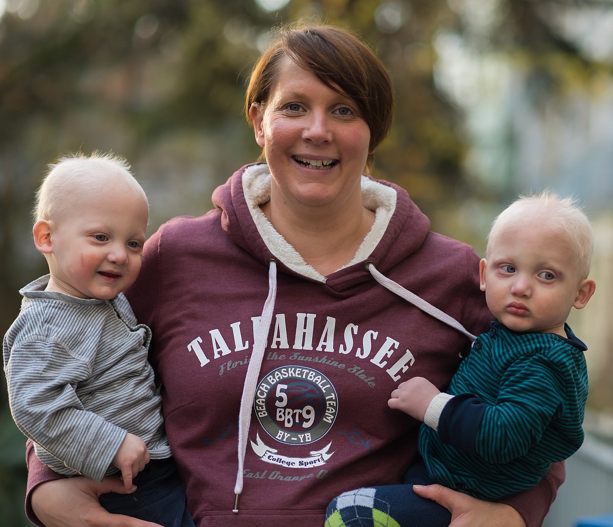 „Ich habe mich damals hin- und hergerissen gefühlt, weil wir keine Referenzen hatten. Aber wir hatten Vertrauen in Prof. Schneider und wollten diese Pionierarbeit leisten. Gemeinsam haben wir die richtige Entscheidung getroffen“, sagt der Vater der Zwillinge, Tobias T., rückblickend. „Für mich war es klar, dass ich eine Behandlung im Mutterleib machen will, wenn ich erneut ein Kind mit Ektodermaler Dysplasie bekommen sollte“, ergänzt seine Frau Corinna T. „Als uns im warmen Auto das erste Mal auffiel, dass die Babyschalen voller Schweiß waren, war das wirklich der Wahnsinn“, erinnert sich die Mutter der Zwillinge. So etwas kannten die Eltern von ihrem ersten Sohn Joshua nicht. Der Erlanger Heilversuch hatte funktioniert – Linus und Maarten schwitzten und hatten damit einen entscheidenden Vorteil gegenüber ihrem großen Bruder, der mit Ektodermaler Dysplasie zur Welt kam und sein Leben lang ohne Schweißdrüsen zurechtkommen muss. „Die Zwillinge können ihre Körpertemperatur völlig normal regulieren – und toll ist auch, dass die beiden mehr Zähne haben als Joshua“, erklärt Corinna T. „Heute in die Klinik zu kommen, ist wie nach Hause kommen. Erlangen ist ein Teil unseres Lebens geworden.“ Tobias T. ergänzt: „Jetzt sind wir nach zehn Jahren vorerst das letzte Mal hier und es schließt sich damit ein Kapitel unseres Lebens.“